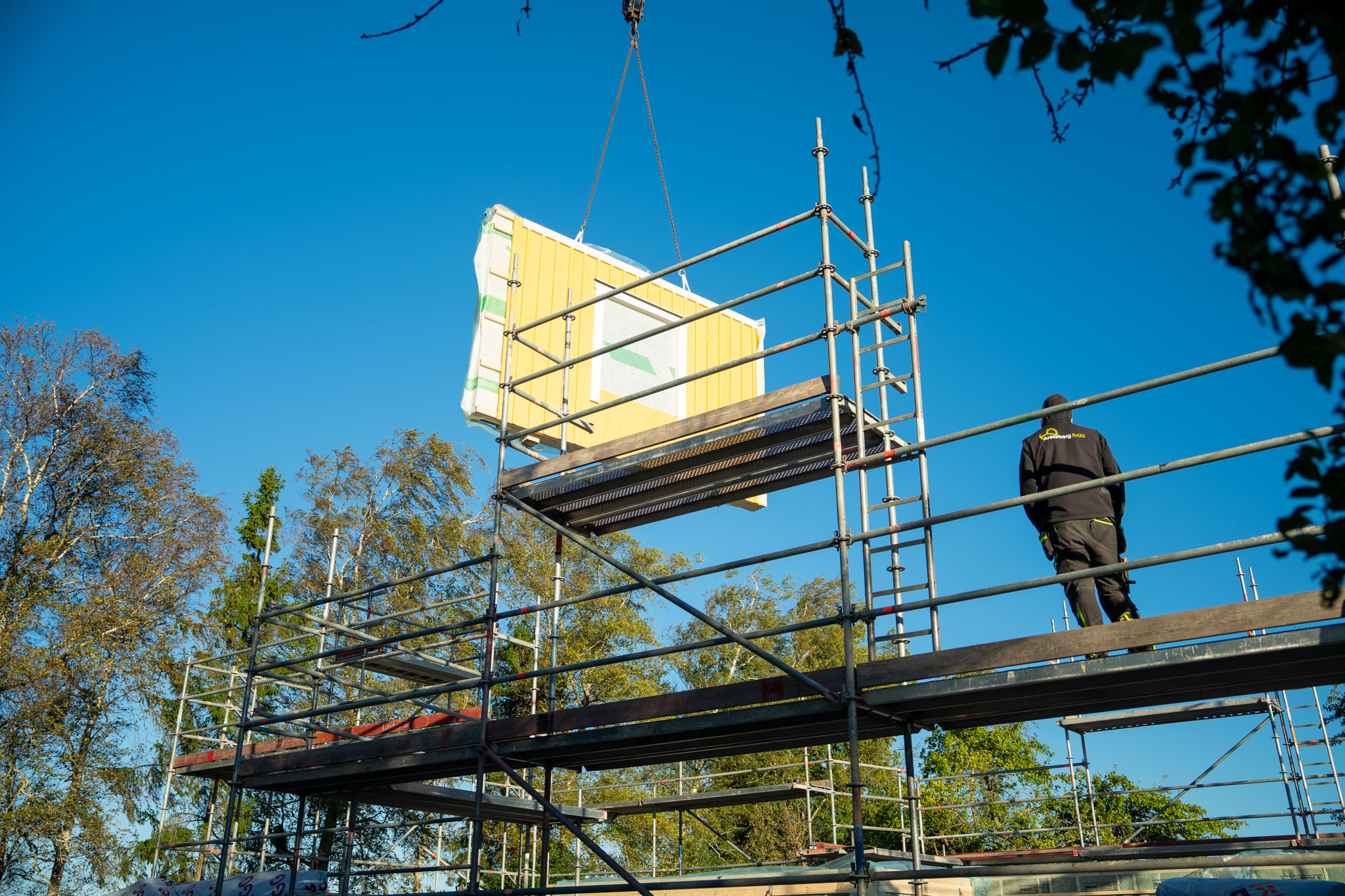 Stommen och takstolarna monteras effektivt och säkert.